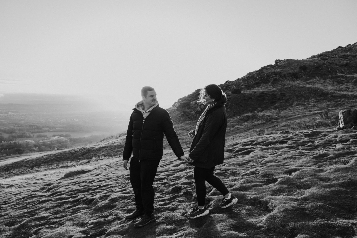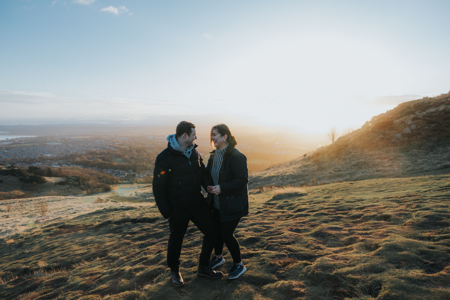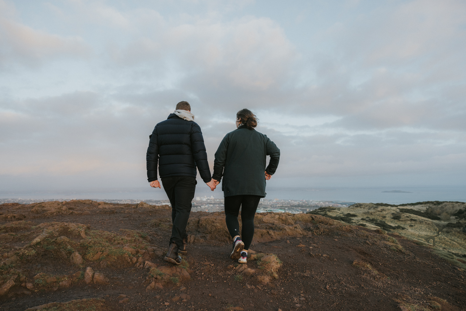Despite the early hour and the chilly weather, the excitement was clear. James had planned the perfect secret proposal with us, the local Edinburgh wedding photographers, and as they approached the summit, the anticipation built with every step. Planning the Arthur’s Seat Surprise Proposal with him in secret was so much fun, but I know he was nervous!
