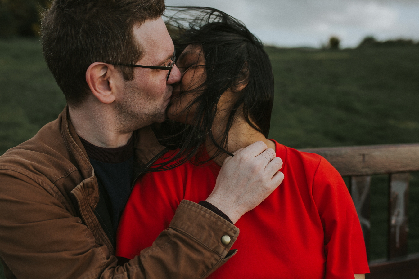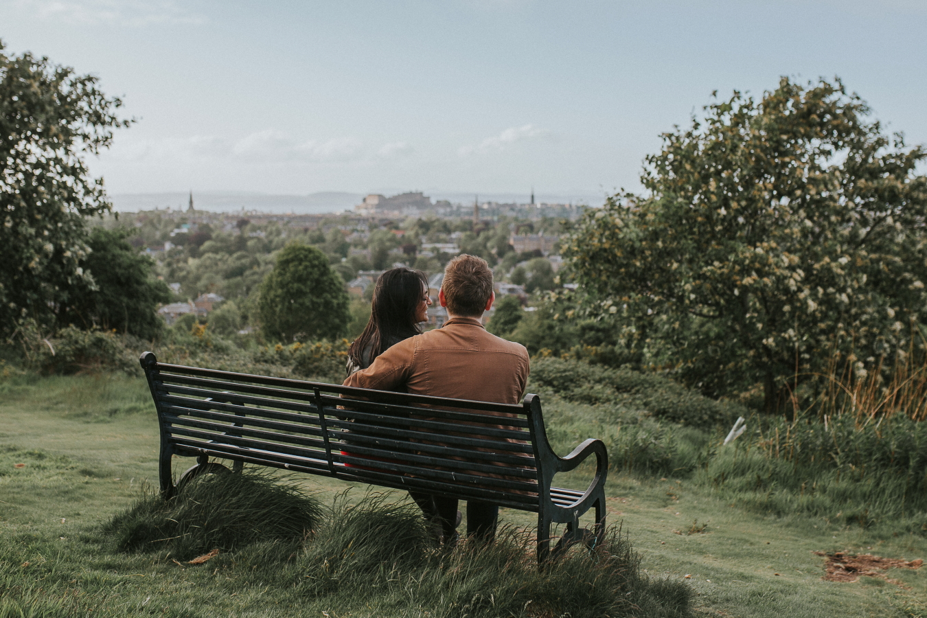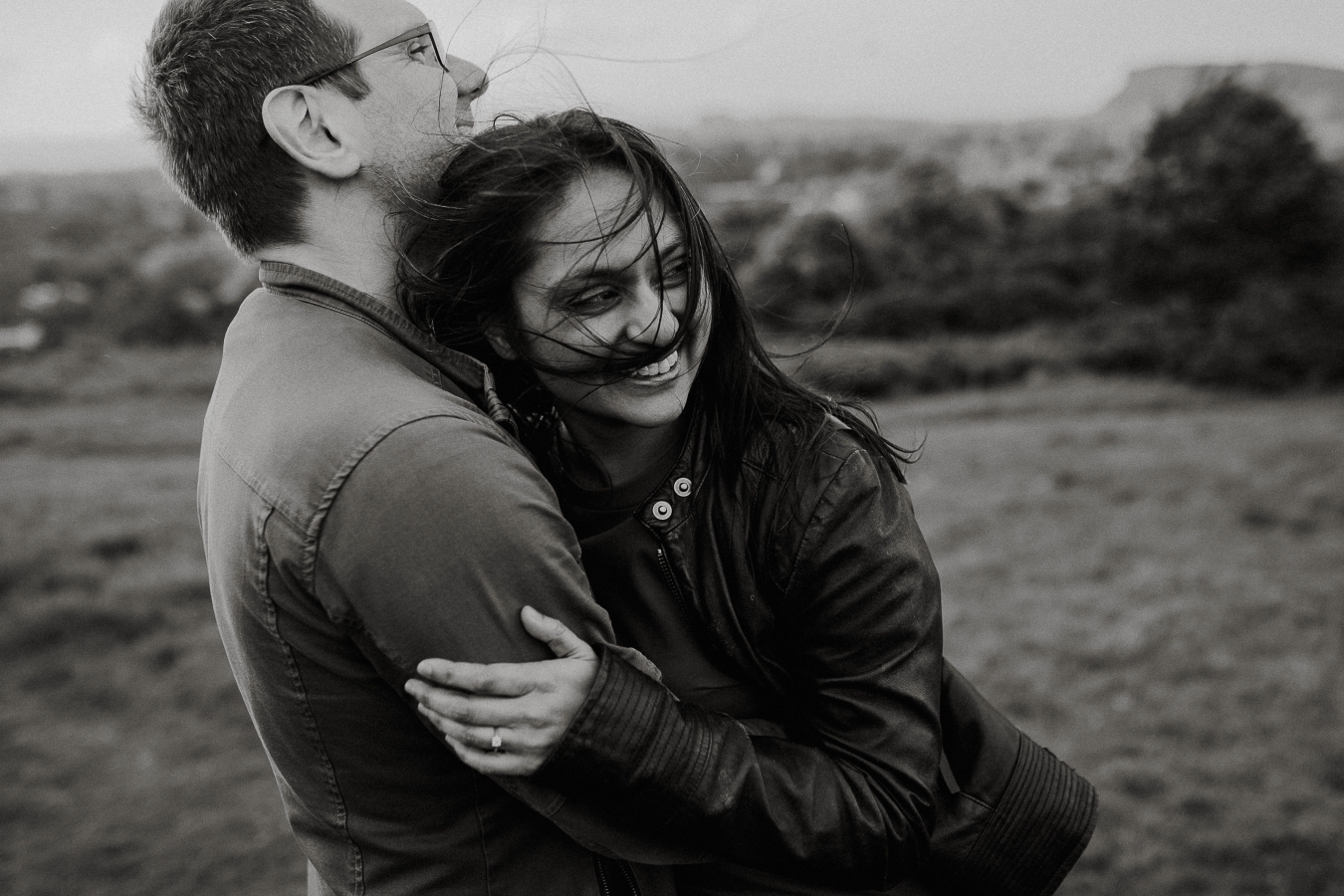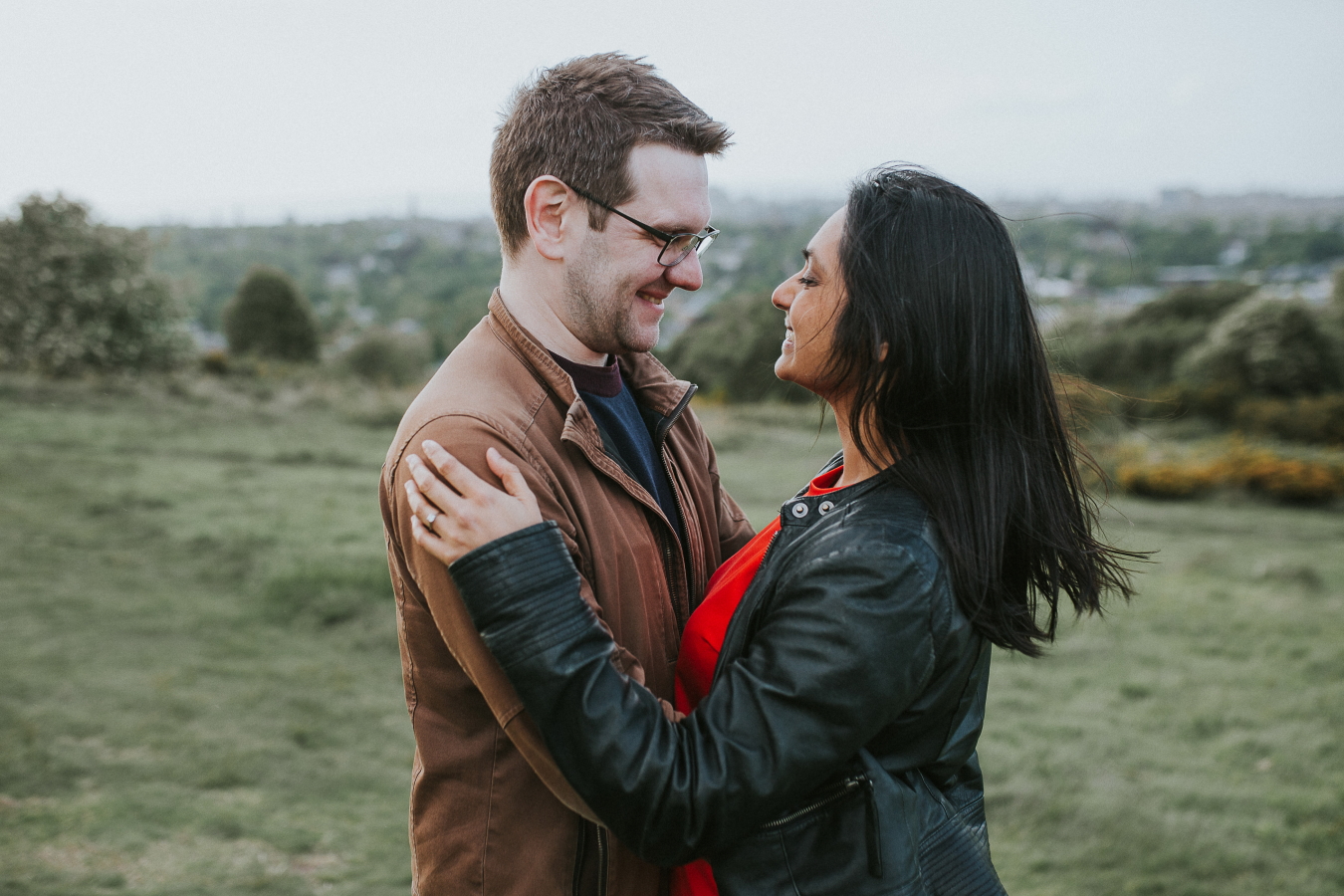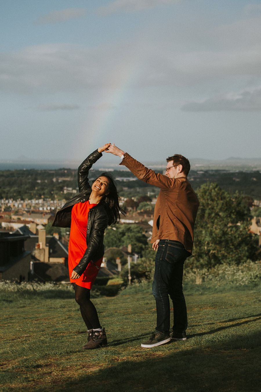 An engagement session was a must have for Shahzya and David. They said they didn’t feel to comfortable in front of the camera and requested a little ‘practice run’. Pre-wedding sessions are wonderful and beneficial. On the wedding day we had a confident and smiley couple. The engagement session on the top of Blackford Hill itself was filled with delightful moments. Their infectious smiles that could light up a room, the heartwarming cuddles they shared, and the endearing stories of their enchanting first date and the emotionally charged proposal. Our walk included a sprinkle of rain, a touch of sunshine, and culminated in a spectacular rainbow, brimming with hope and beauty, under which they joyfully danced, their hearts entwined.